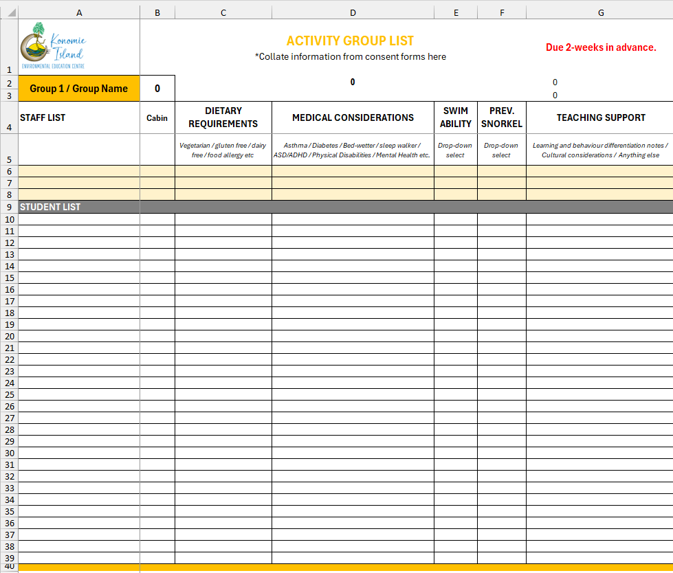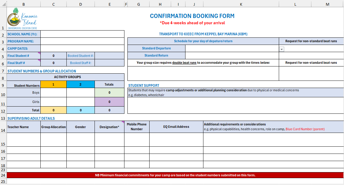 Your KIEEC Camp Coordinator will email a personalised link to your digital "School Camp Planning form". This is a live, online excel spreadsheet that only you and KIEEC can access to collate your booking information.